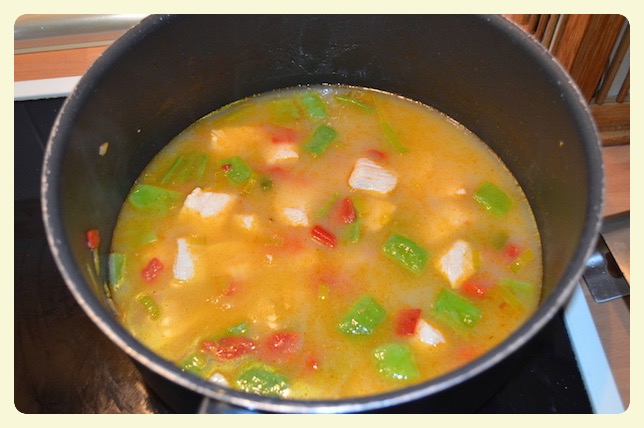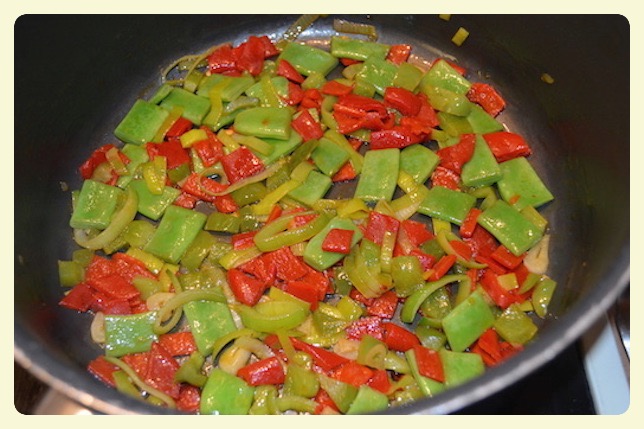 El puerro cortado en juliana, las judías y los pimientos en trocitos y vamos rehogando y añadiendo caldo de los pimientos de piquillo.