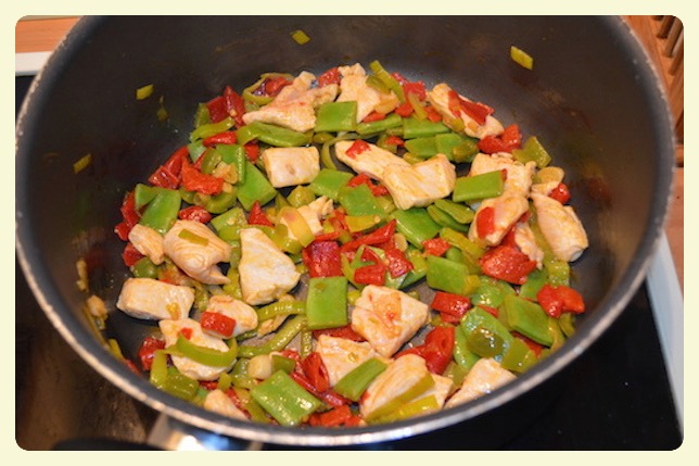 Cuando el pollo comience a dorarse añadimos el caldo y llevamos a ebullición, en este momento añadimos el arroz, removemos y dejamos cocer a fuego medio 20 minutos SIN TAPAR, removiendo bien de vez en cuando para que no se nos pegue.