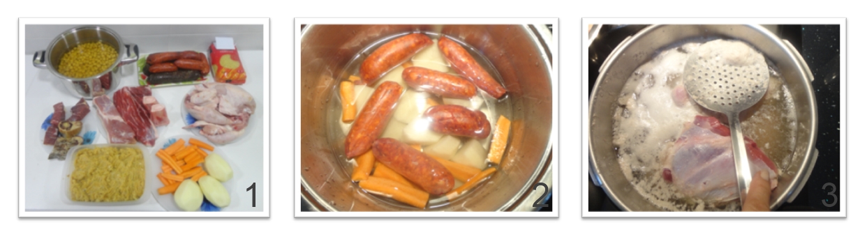 Lo primero, es colocar en la olla los garbanzos (después de escurrirlos), a continuación las carnes y posteriormente el agua (hasta casi completar la capacidad de la olla).