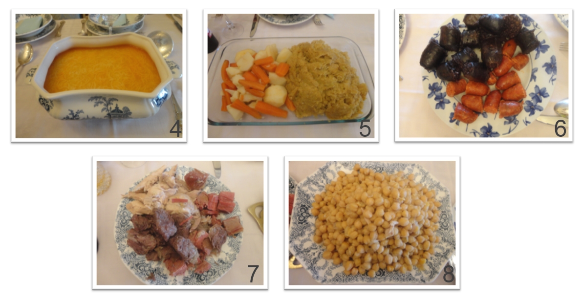 El primer vuelco es la sopa, el segundo es el plato de las verduras cocidas junto con los garbanzos y el tercer vuelco el plato de las carnes.