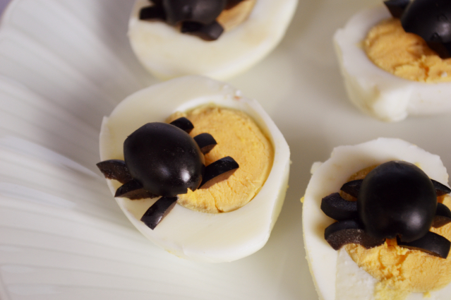 Cocemos unos huevos y los partimos por la mitad. En el centro de cada mitad de huevo cocido colocamos media aceituna negra y la otra mitad la partimos en trocitos simulando las patas de una araña.