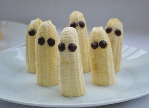 Pelamos unos plátanos, lo partimos por la mitad y colocamos 2 pepitas de chocolate simulando los ojos.