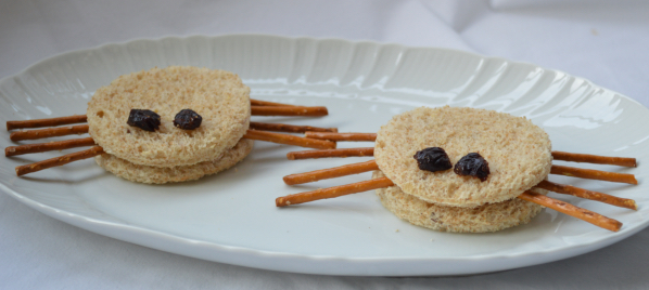 Cortamos pan de molde en forma redonda y ponemos el relleno que hayamos elegido y formamos el sándwich. Con 8 palitos salados de aperitivo simulamos las patas de la araña y con unas ciruelas pasas negras hacemos los ojos.