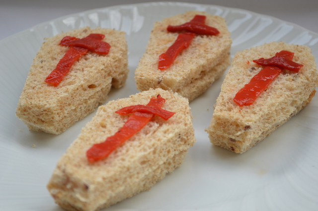 Se trata de cortar pan de molde con forma de lápida, rellenarlo con lo que elijamos y encima ponemos una cruz hecha con pimientos del piquillo. De miedo!!